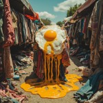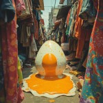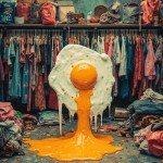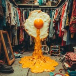 Psychedelic Retro Style Fried Egg Melting with Clothes in Second-Hand Market