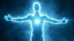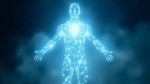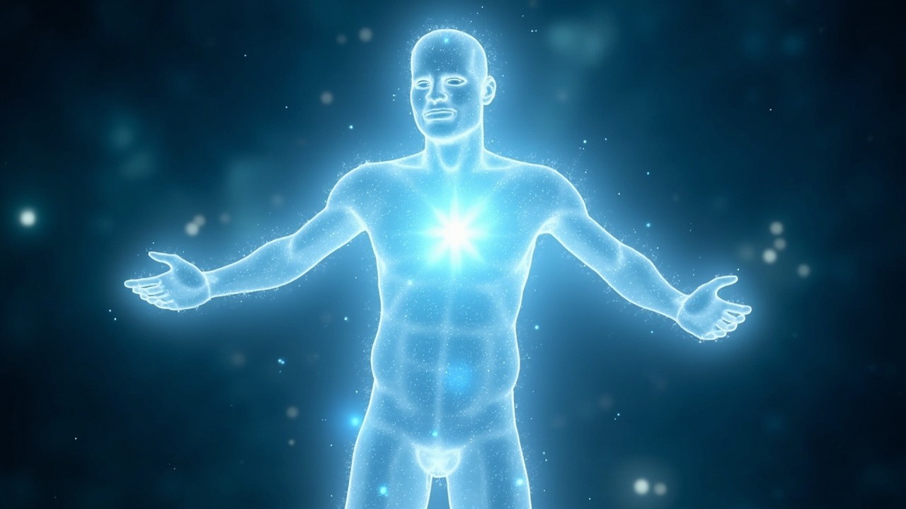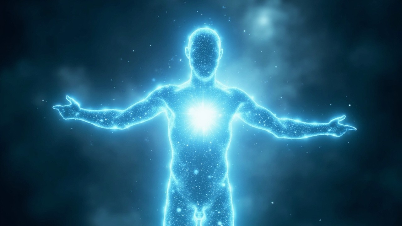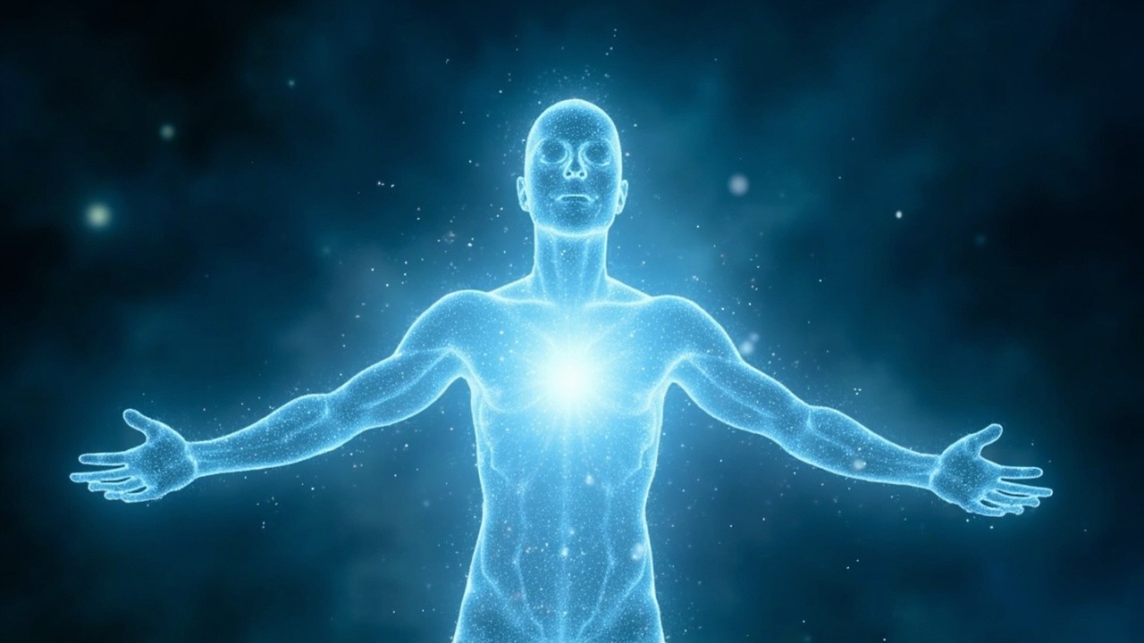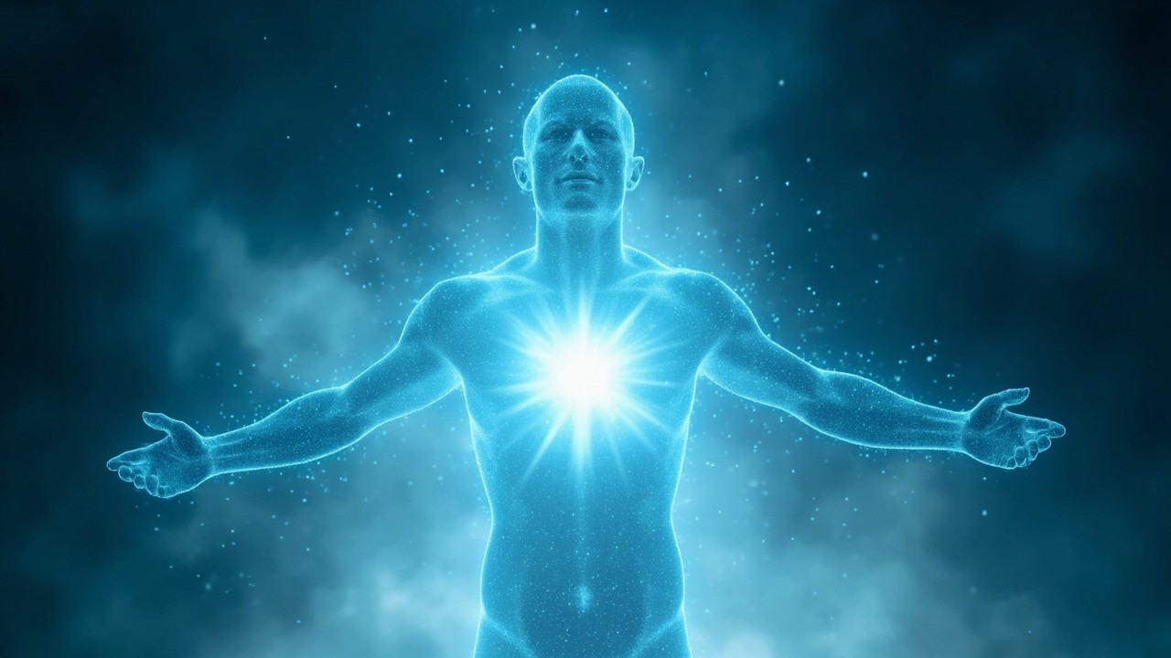 Glowing human energy body made of white light particles, full body silhouette with arms open, radiant heart center glowing bright blue, subtle particles floating and drifting outward, calm cosmic background, spiritual energy field, higher consciousness, breathwork visualization, soft luminous glow, ultra detailed, cinematic lighting, peaceful and expansive feeling