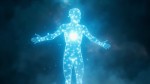 Full Body Silhouette with Glowing Blue Heart and Cosmic Background