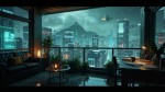 Futuristic open-air apartment balcony at night, overlooking a rainy cyberpunk city. Interior has a dark leather sofa, small round table with a candle, indoor plants, books, mugs, and a wooden desk with glowing gadgets and papers. The cityscape features neon-lit skyscrapers, holographic billboards, flying vehicles, communication towers, and distant pyramid-shaped megastructures rising from misty mountains. Ambient lighting, cinematic rain, wet reflective surfaces, moody atmosphere, photorealistic, 4K detail.