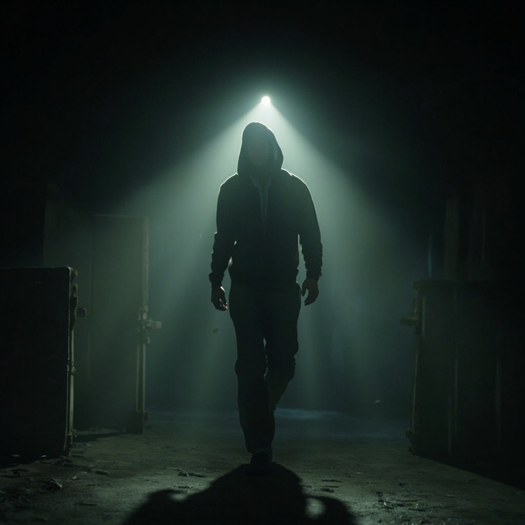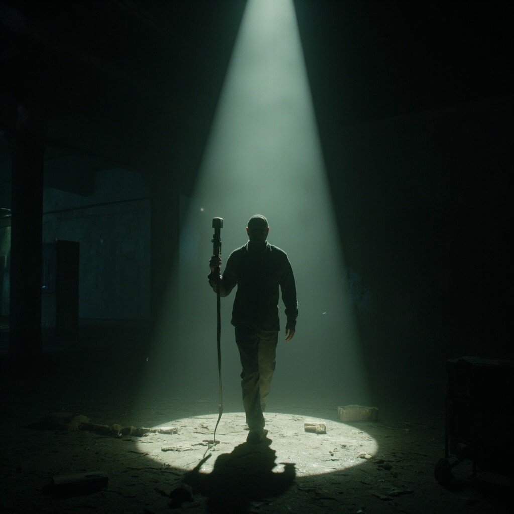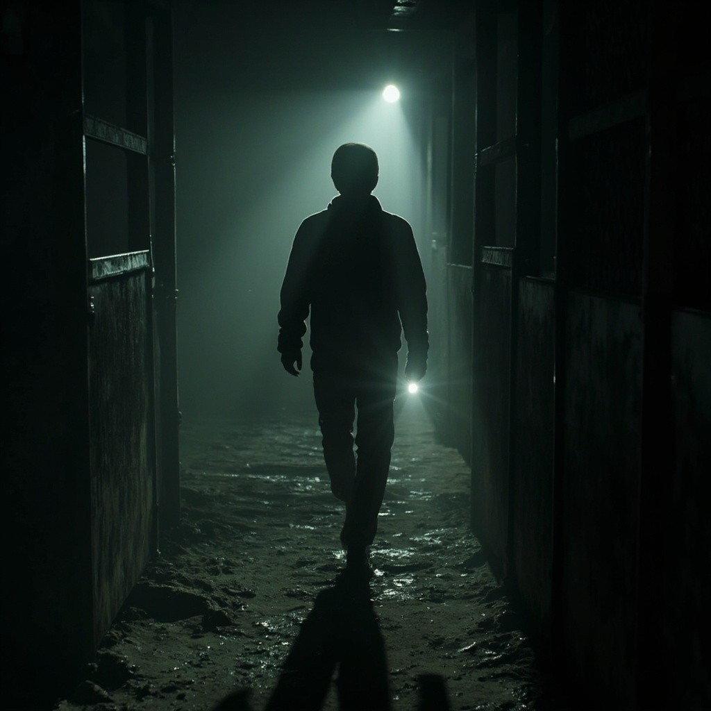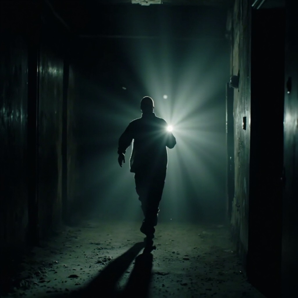 OThe camera represents a real human point of view walking slowly inside the same location. Movement is grounded and realistic: subtle vertical bob from footsteps, gentle side-to-side sway, imperfect handheld motion. The viewer is holding a flashlight; the beam reacts naturally to walking and turning with delayed movement, small overcorrections, uneven scanning. The character remains completely still and lifeless: no animation, no blinking, no breathing, no movement. Only environmental motion: floating dust, minimal light flicker, very subtle movement of loose elements. The environment stays consistent the whole shot: no set changes, no teleporting, no new objects. Photorealistic video, found-footage realism, handheld walking camera, low light, strong shadows, gritty textures, natural imperfections.