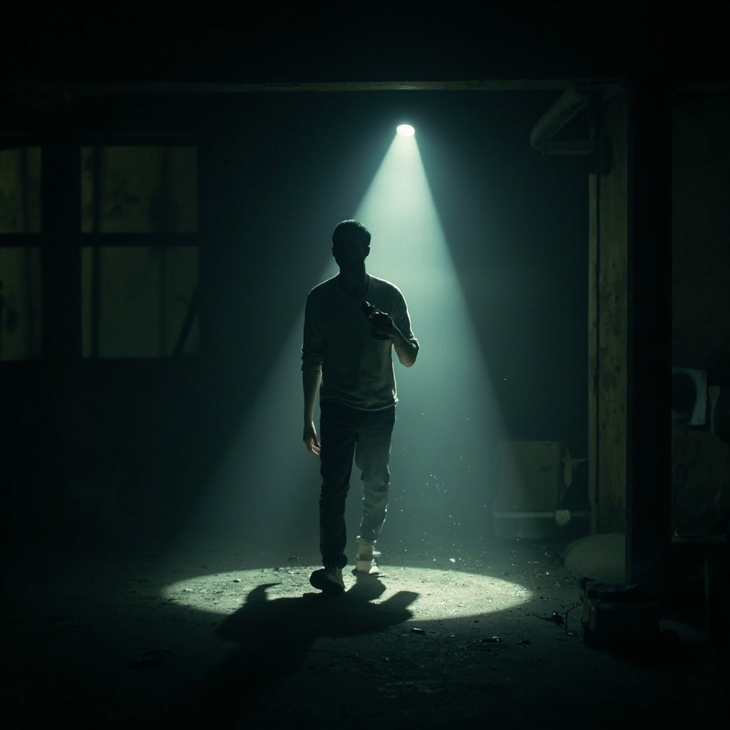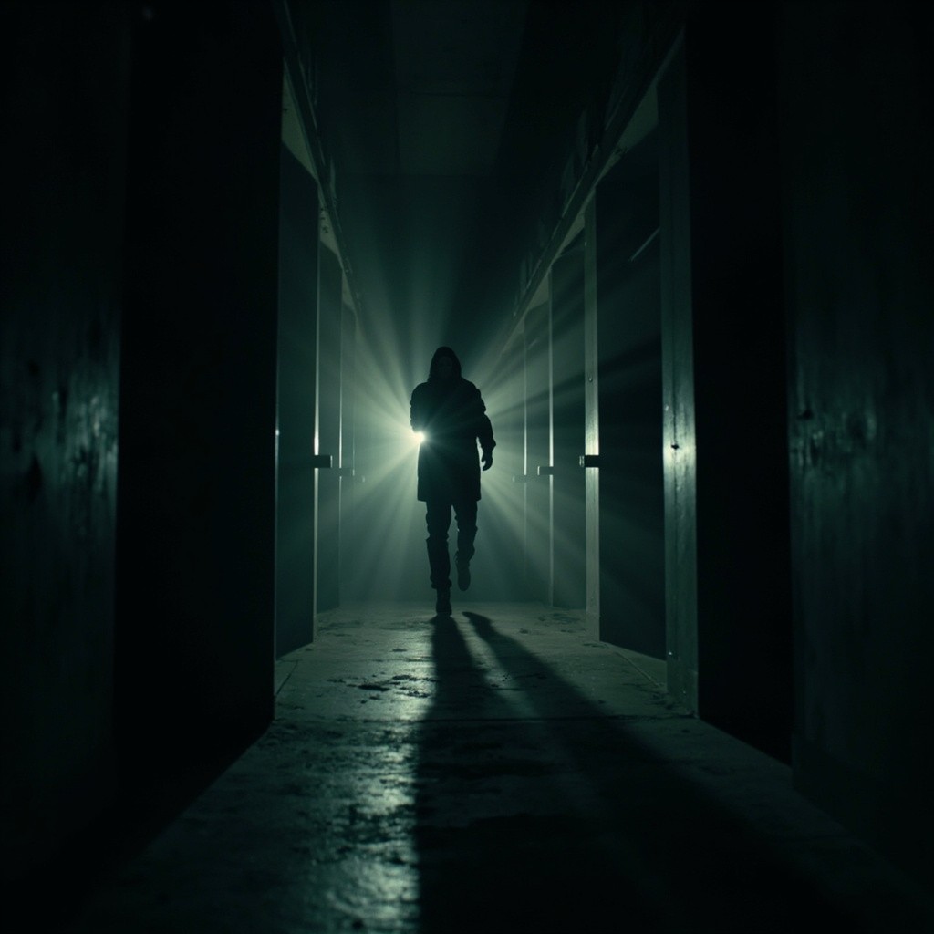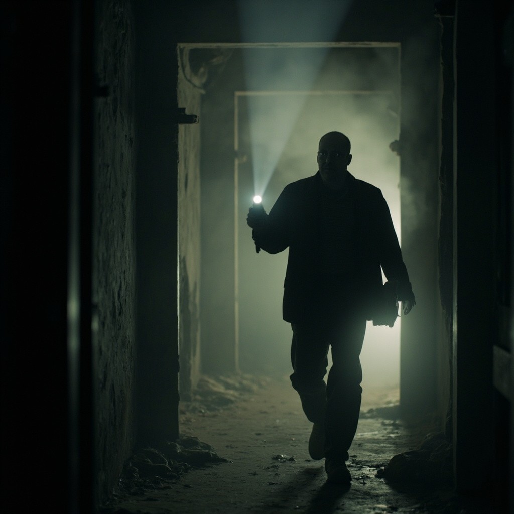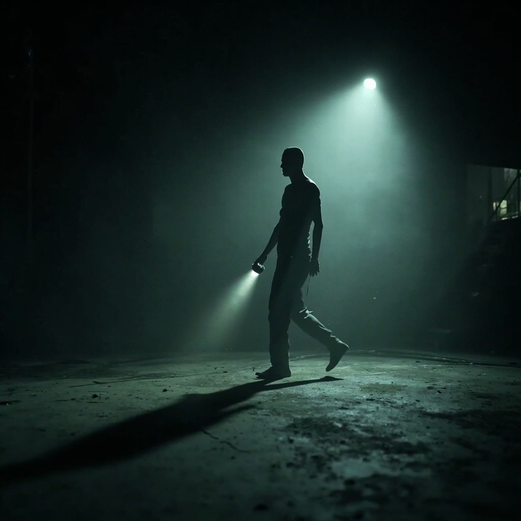 OThe camera represents a real human point of view walking slowly inside the same location. Movement is grounded and realistic: subtle vertical bob from footsteps, gentle side-to-side sway, imperfect handheld motion. The viewer is holding a flashlight; the beam reacts naturally to walking and turning with delayed movement, small overcorrections, uneven scanning. The character remains completely still and lifeless: no animation, no blinking, no breathing, no movement. Only environmental motion: floating dust, minimal light flicker, very subtle movement of loose elements. The environment stays consistent the whole shot: no set changes, no teleporting, no new objects. Photorealistic video, found-footage realism, handheld walking camera, low light, strong shadows, gritty textures, natural imperfections.