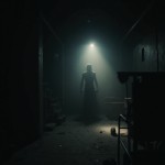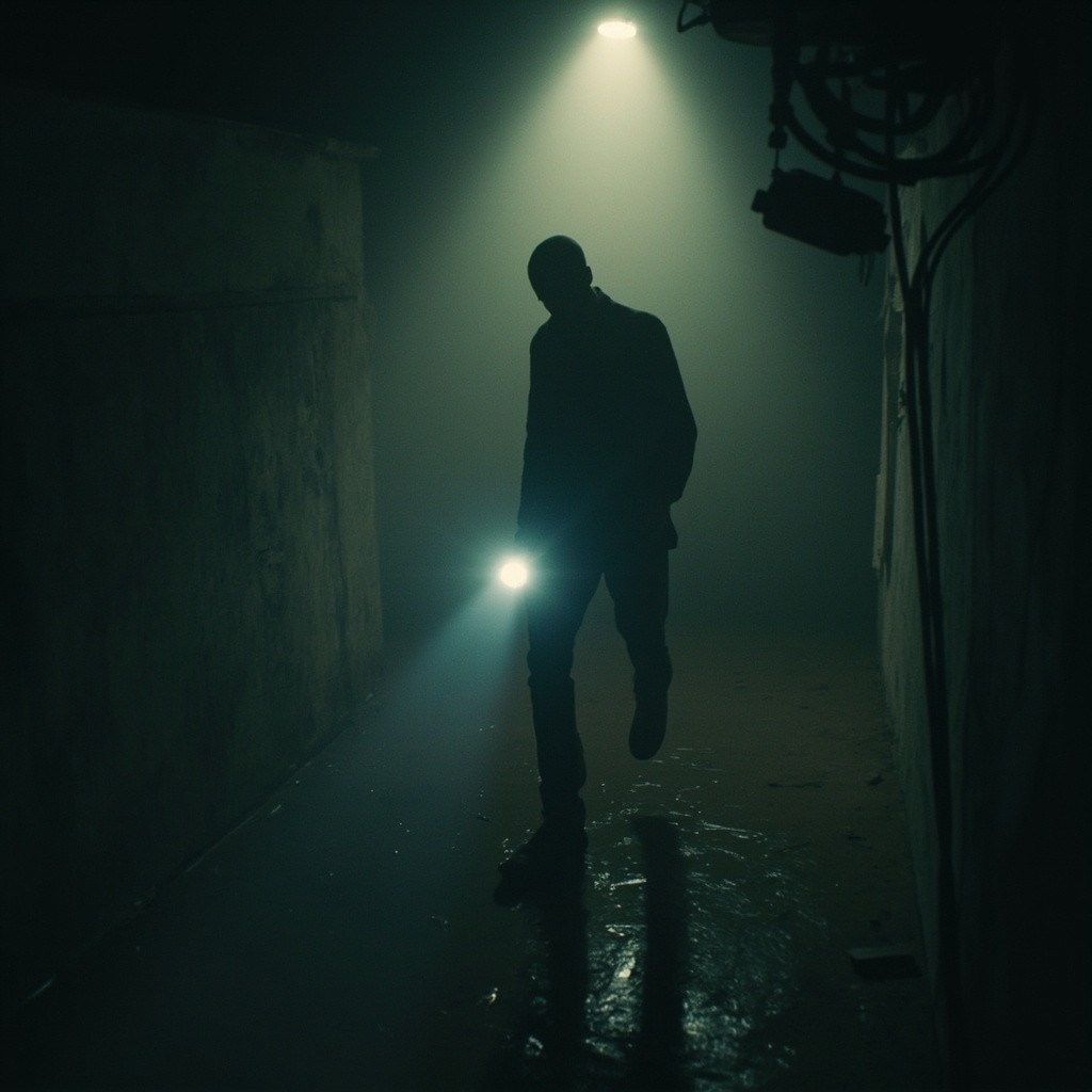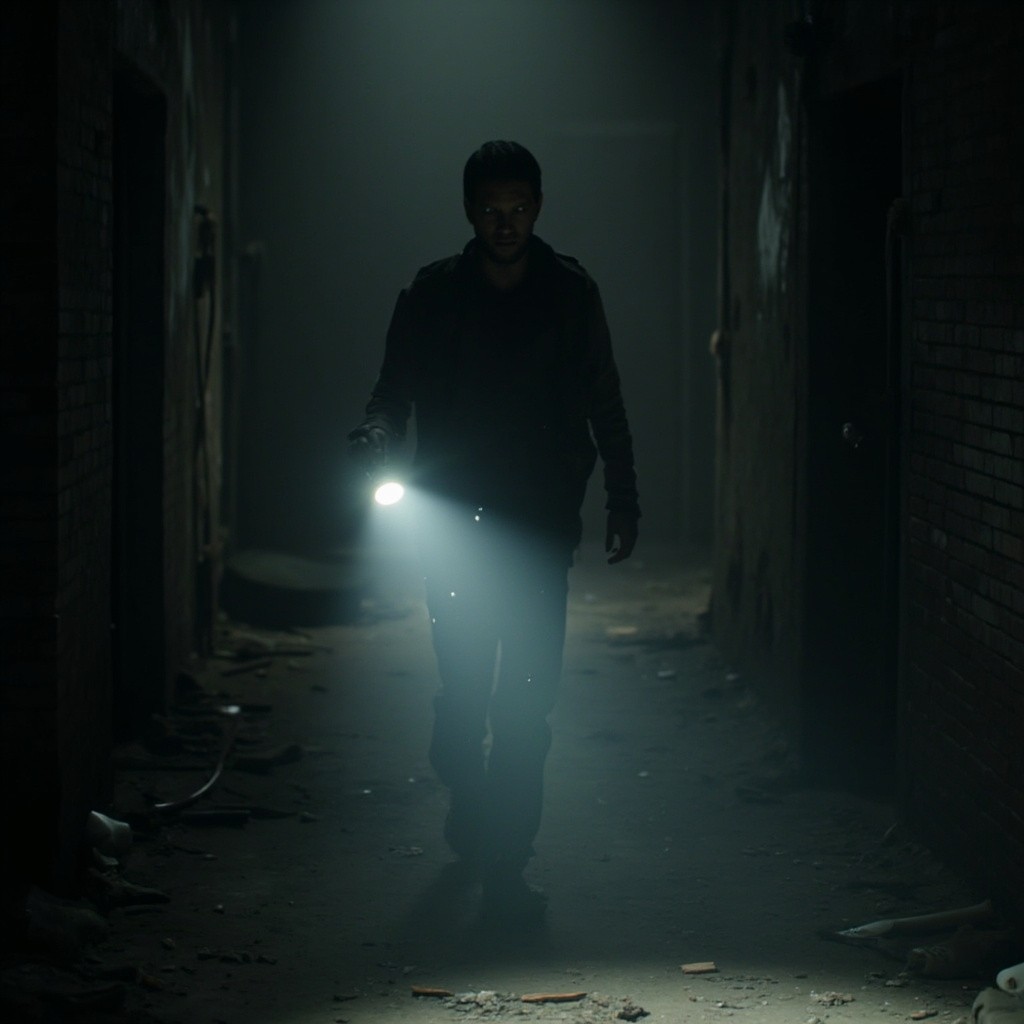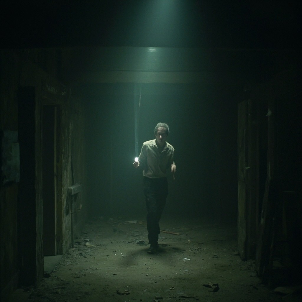 The camera represents a real human point of view walking slowly inside the same location. Movement is grounded and realistic: subtle vertical bob from footsteps, gentle side-to-side sway, imperfect handheld motion. The viewer is holding a flashlight; the beam reacts naturally to walking and turning with delayed movement, small overcorrections, uneven scanning. The character remains completely still and lifeless: no animation, no blinking, no breathing, no movement. Only environmental motion: floating dust, minimal light flicker, very subtle movement of loose elements. The environment stays consistent the whole shot: no set changes, no teleporting, no new objects. Photorealistic video, found-footage realism, handheld walking camera, low light, strong shadows, gritty textures, natural imperfections