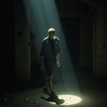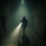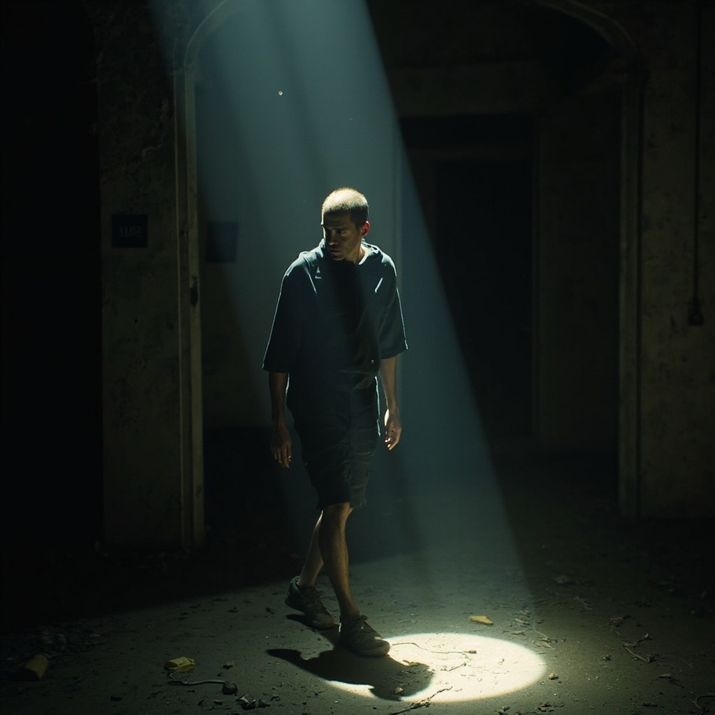 @حمودي البياتي:OThe camera represents a real human point of view walking slowly inside the same location. Movement is grounded and realistic: subtle vertical bob from footsteps, gentle side-to-side sway, imperfect handheld motion. The viewer is holding a flashlight; the beam reacts naturally to walking and turning with delayed movement, small overcorrections, uneven scanning. The character remains completely still and lifeless: no animation, no blinking, no breathing, no movement. Only environmental motion: floating dust, minimal light flicker, very subtle movement of loose elements. The environment stays consistent the whole shot: no set changes, no teleporting, no new objects. Photorealistic video, found-footage realism, handheld walking camera, low light, strong shadows, gritty textures, natural imperfections.