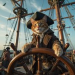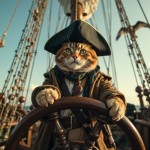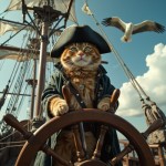 Red Cat in Broad-Brimmed Hat Steering Galleon with Sword and Albatross in Sky