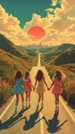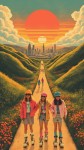 13h make a 70’s style graphic art pic of a group of roller skaters in cute outfits pertaining to the fashion of the time … skating towards a beautiful scene of hills and puffy clouds with hills covered in wild flowers on both sides of the road at sunset in the distance is a futuristic city that’s more futuristic 2080 than 70’s. The vibe is happy.