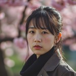 Japanese Woman in Kimono with Tear, Cherry Blossom Background