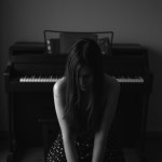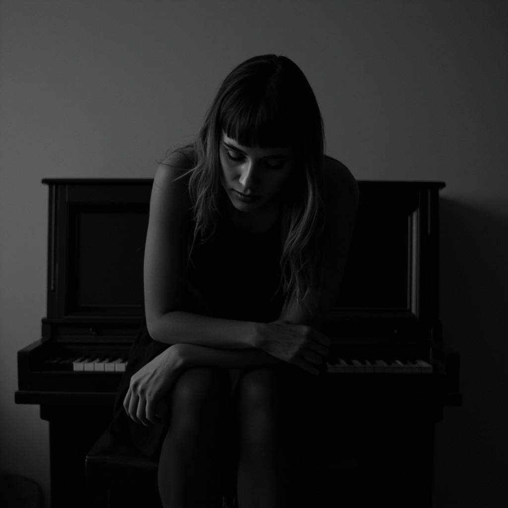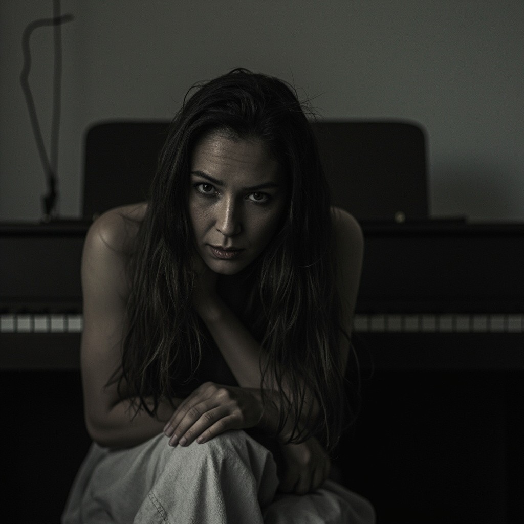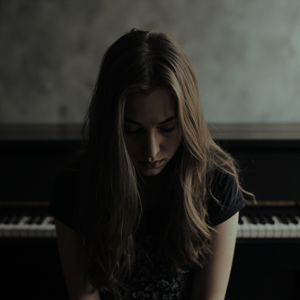 Melancholic Woman with Long Hair Sitting in Front of Piano