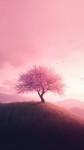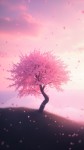 Lone Sakura Tree in Full Bloom Under Pastel Pink Sky at Sunrise