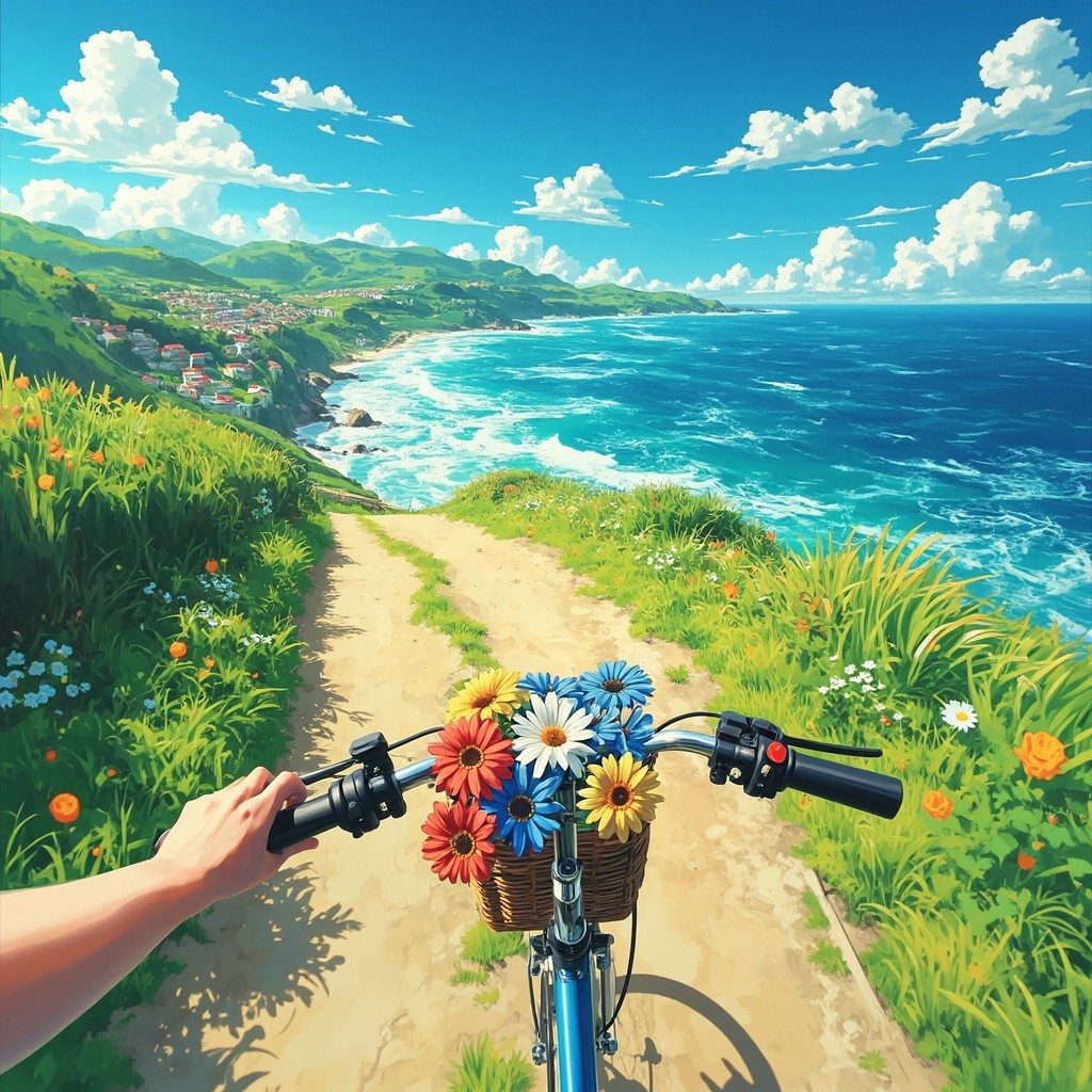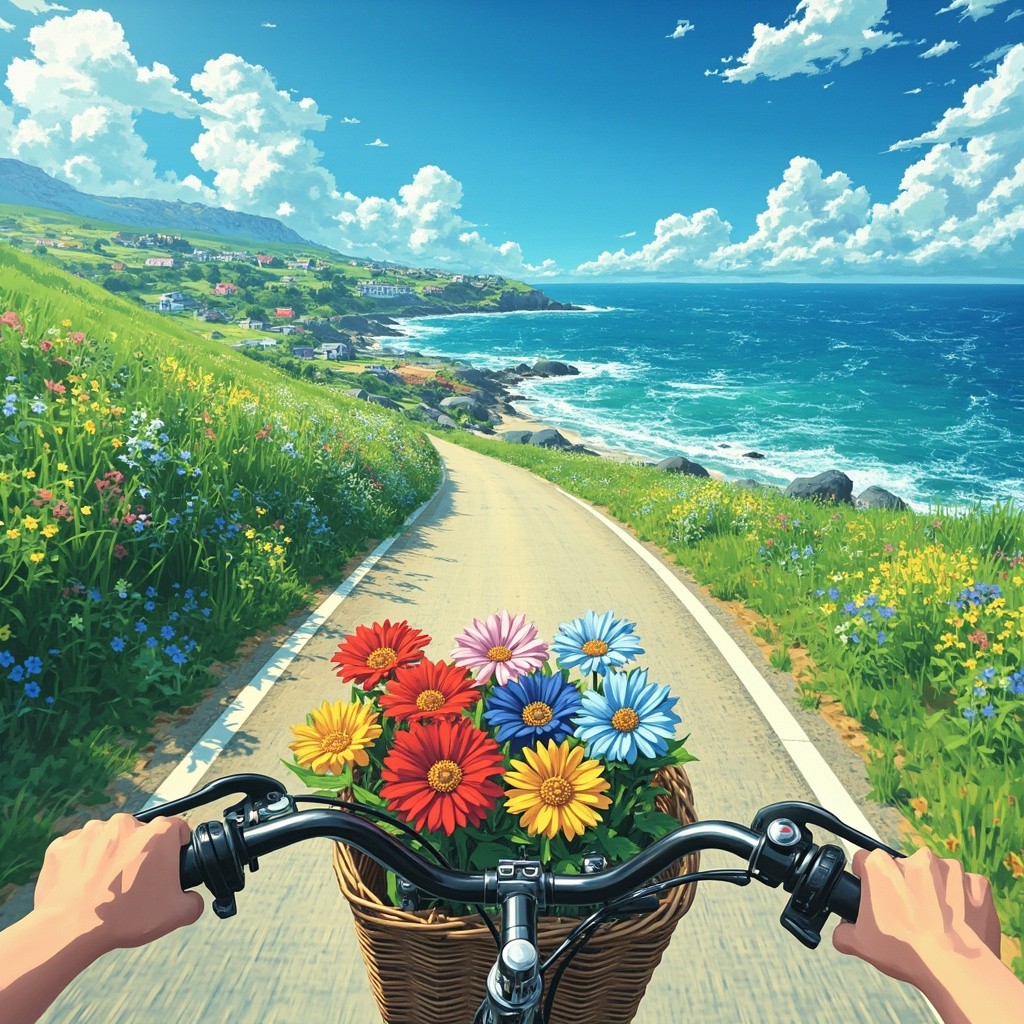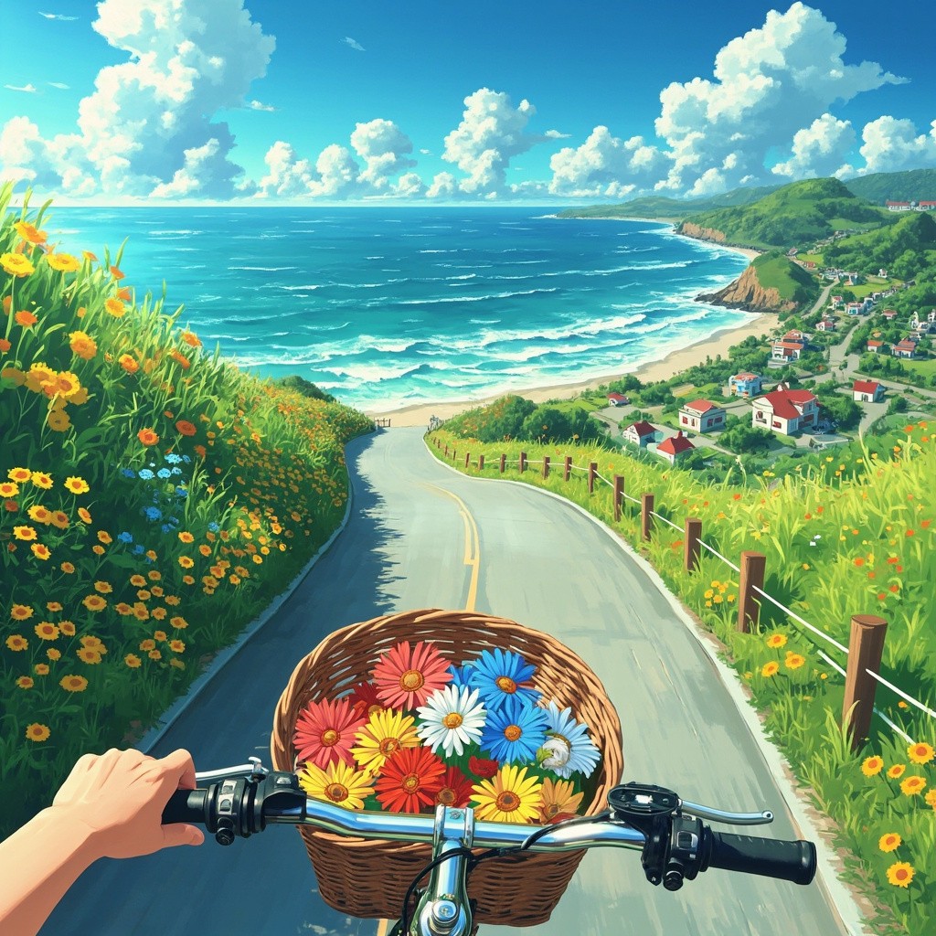 A drone view view from a bicycle riding downhill on a sunny coastal road. The handlebars and a hand are visible in the foreground, with a woven basket on the front of the bicycle filled with colorful flowers — red, blue, and yellow daisies. The road curves gently through lush green grass and wildflowers, leading toward a scenic seaside village with small houses and rooftops. The sparkling turquoise ocean stretches out on the right, with foamy waves crashing against the shore. Puffy white clouds float in a vibrant blue sky. The entire image has a bright, cheerful, and anime-style painterly look, reminiscent of Studio Ghibli or Makoto Shinkai aesthetics. Style tags: anime-style, coastal view, Studio Ghibli, summer vibes, scenic bike ride, colorful flowers, peaceful journey, cinematic frame, painterly illustration, POV angle