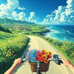 Anime-Style Bicycle Ride Downhill on Sunny Coastal Road Illustration