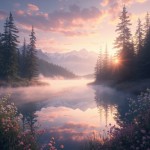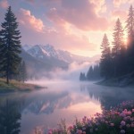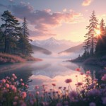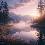 A serene, dreamlike landscape at golden hour, with soft, warm sunlight filtering through tall, misty pine trees. A calm, reflective lake mirrors the sky, surrounded by delicate wildflowers in pastel colors. Gentle fog drifts across the water, creating a mystical atmosphere. In the distance, snow-capped mountains rise under a vibrant sky painted with pink, purple, and orange hues. Soft, cinematic lighting highlights textures and details, giving the scene a painterly, ethereal quality. Ultra-detailed 8K resolution, photorealistic, high dynamic range, depth of field, highly aesthetic, tranquil, immersive environment.