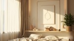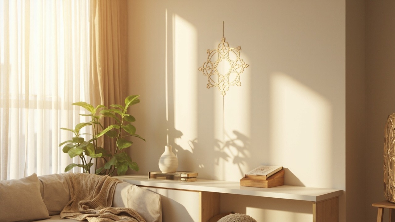 A serene modern Muslim home interior featuring a dedicated Quran display corner. Minimal wooden Quran stand placed on a floating shelf, soft beige and ivory color palette, natural light streaming through sheer curtains, subtle Islamic geometric wall art in gold accents, warm ambient lighting, calm and spiritual atmosphere. Clean modern styling with organic textures, linen fabrics, indoor plant, peaceful and respectful setting. High-resolution, ultra-realistic, US interior decor trend 2026, aesthetic, calm, sacred, clutter-free. ✨ Optional Overlay Text (Bold & Clear – 2026 Trend)Where Faith Meets Serenity