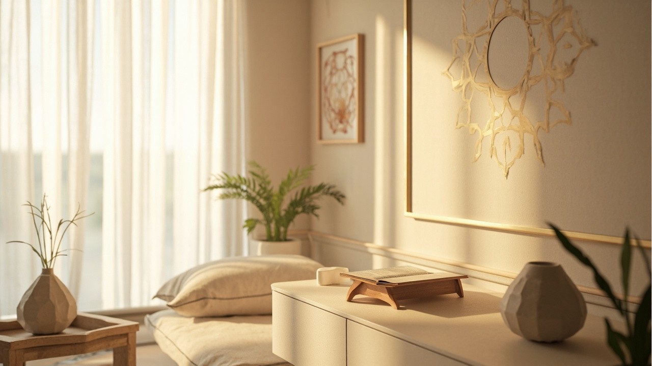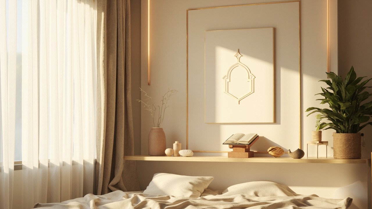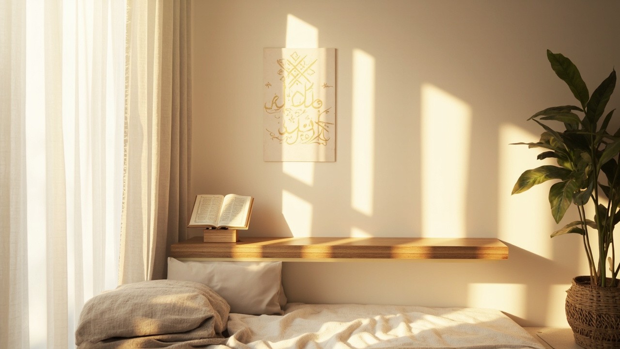 Serene Muslim Home Interior with Quran Display Corner in Modern Style