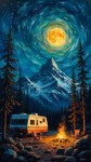 Painterly-style night camping scene in the Canadian Rockies. A cozy camper van parked in a forest clearing beside a warm, glowing campfire. Two chairs are placed near the fire, surrounded by tall pine trees. Majestic snow-covered mountains rise in the background under a swirling night sky. A full moon glows brightly, casting magical reflections and colors—shades of deep blue, green, orange, and violet—across the sky, reminiscent of Van Gogh's brush strokes. The entire scene feels serene, adventurous, and warmly lit in contrast to the cool, moonlit wilderness. Oil painting texture, highly detailed, vibrant, and dreamlike."