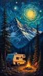 Painterly Night Camping Scene in Canadian Rockies with Camper Van and Campfire