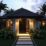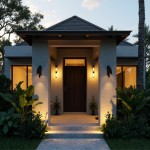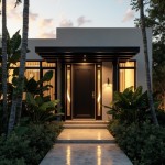 A Hyperrealistic render, Full HD tropical modern Tulum, bali indonesian Style, chukum texture on walls. dark wood door. Outdoor led Lighting. Warm indoor lightning in windows. The landscaping is meticulous: sculpted greenery, plants are arranged to frame the entrance. The overall atmosphere is serene, with a soft, early-evening sky providing a gentle backdrop that highlights the home’s refined architectural lines and lush, tropical-inspired setting.