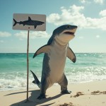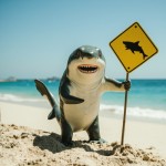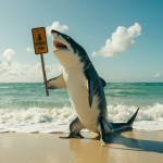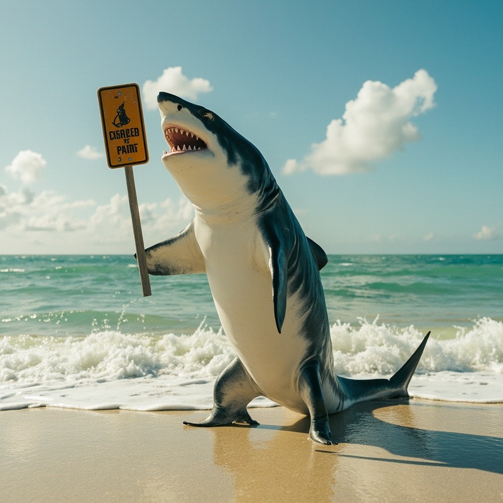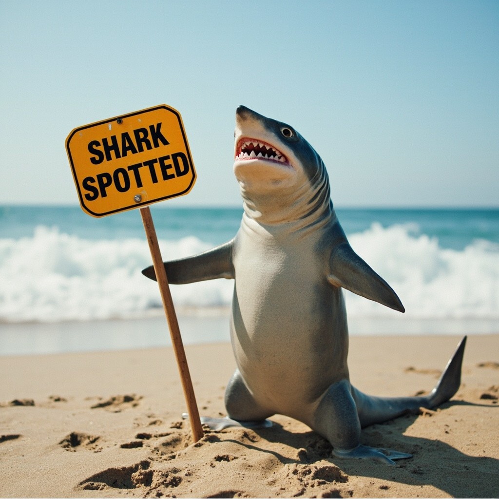 Shark Holding Shark Spotted Sign on Beach