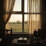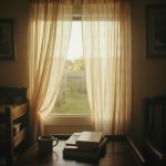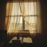 Simple House with Flying Curtains, Religious Books and Coffee on Table