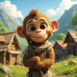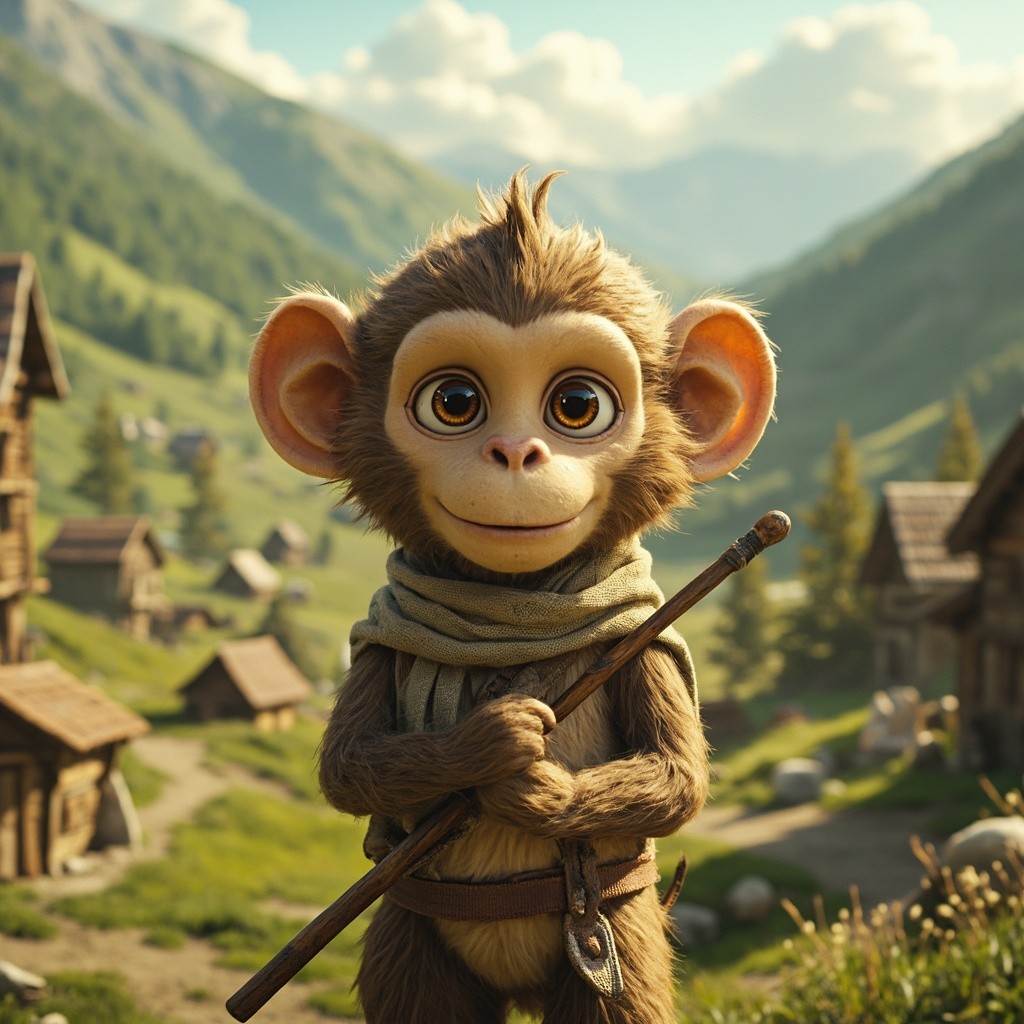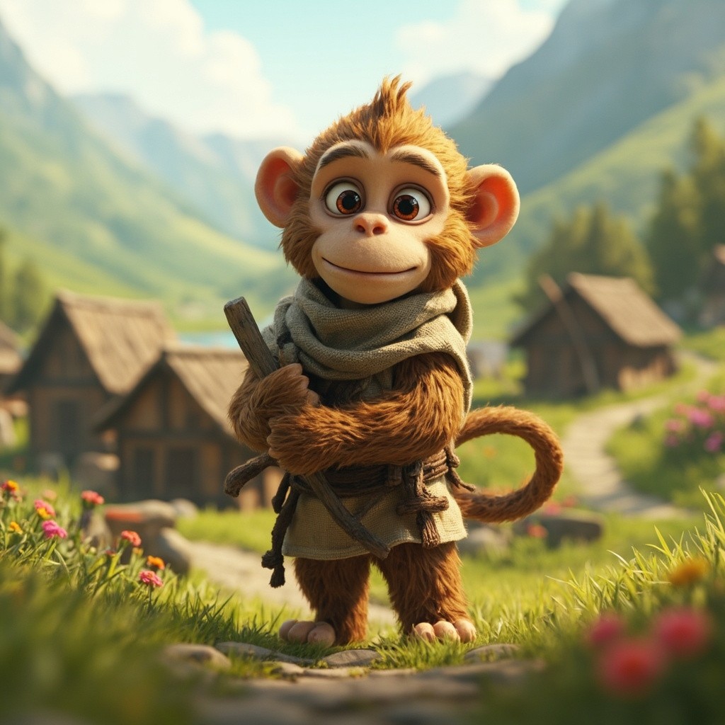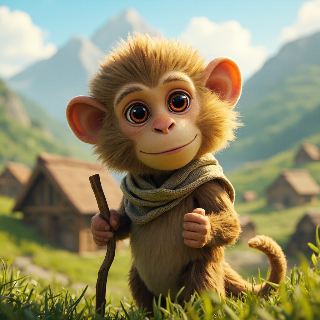 Rivo is a slightly larger monkey about the height of a small human child, with light brown fur, soft and detailed, big round expressive eyes, gentle heroic face, slightly rounded cheeks, small nose, short tail, balanced proportions, cute yet strong posture. He wears a simple rustic shepherd cloth around his waist and holds a wooden stick. Ultra realistic fur, natural colors, clean textures, consistent appearance in every frame.” Scene: Peaceful mountain village, green valleys, wooden huts, bright sunlight, ultra realistic, clean composition.
