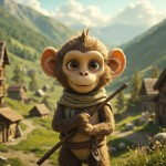 Rustic Monkey Shepherd with Wooden Stick in Mountain Village