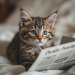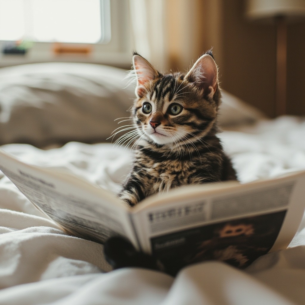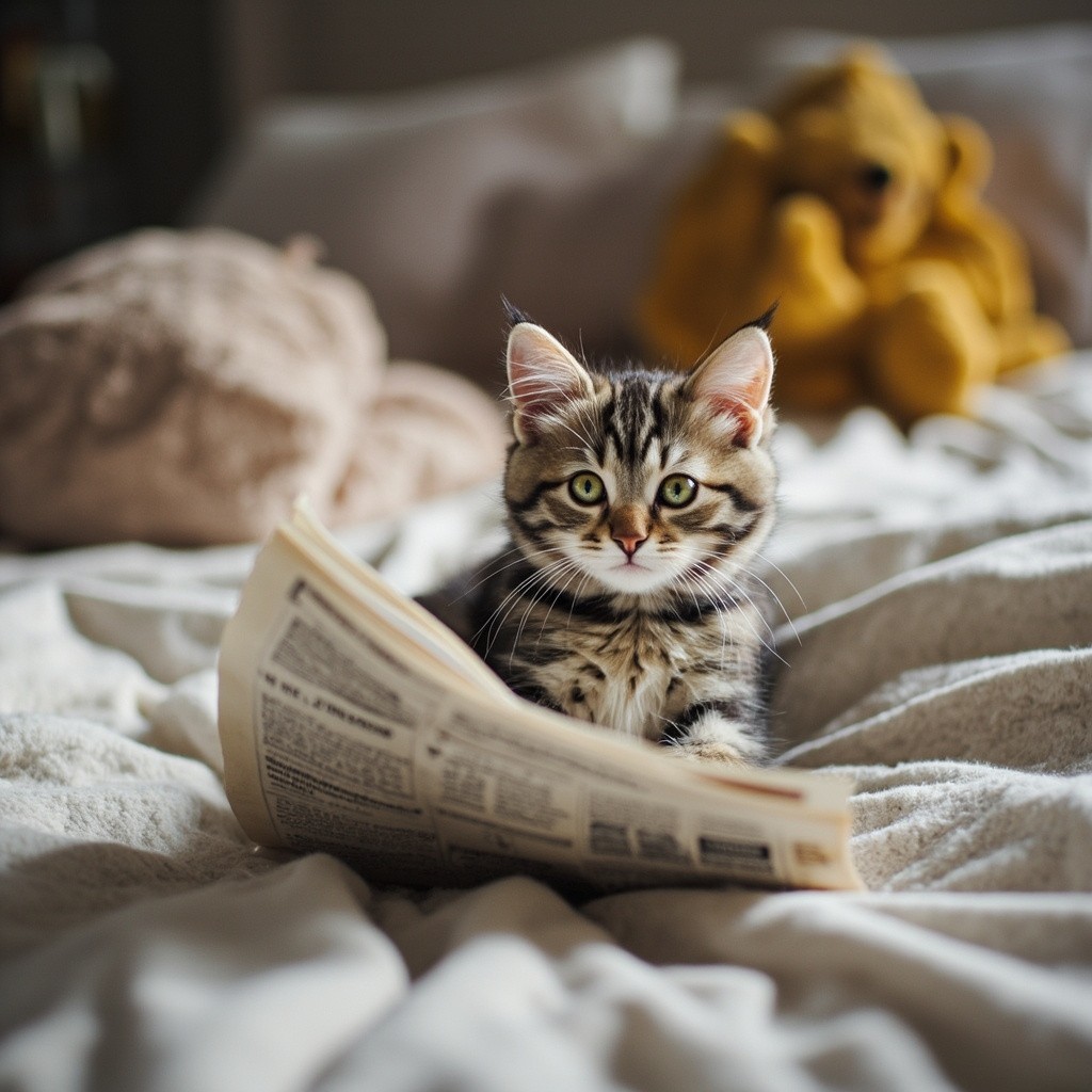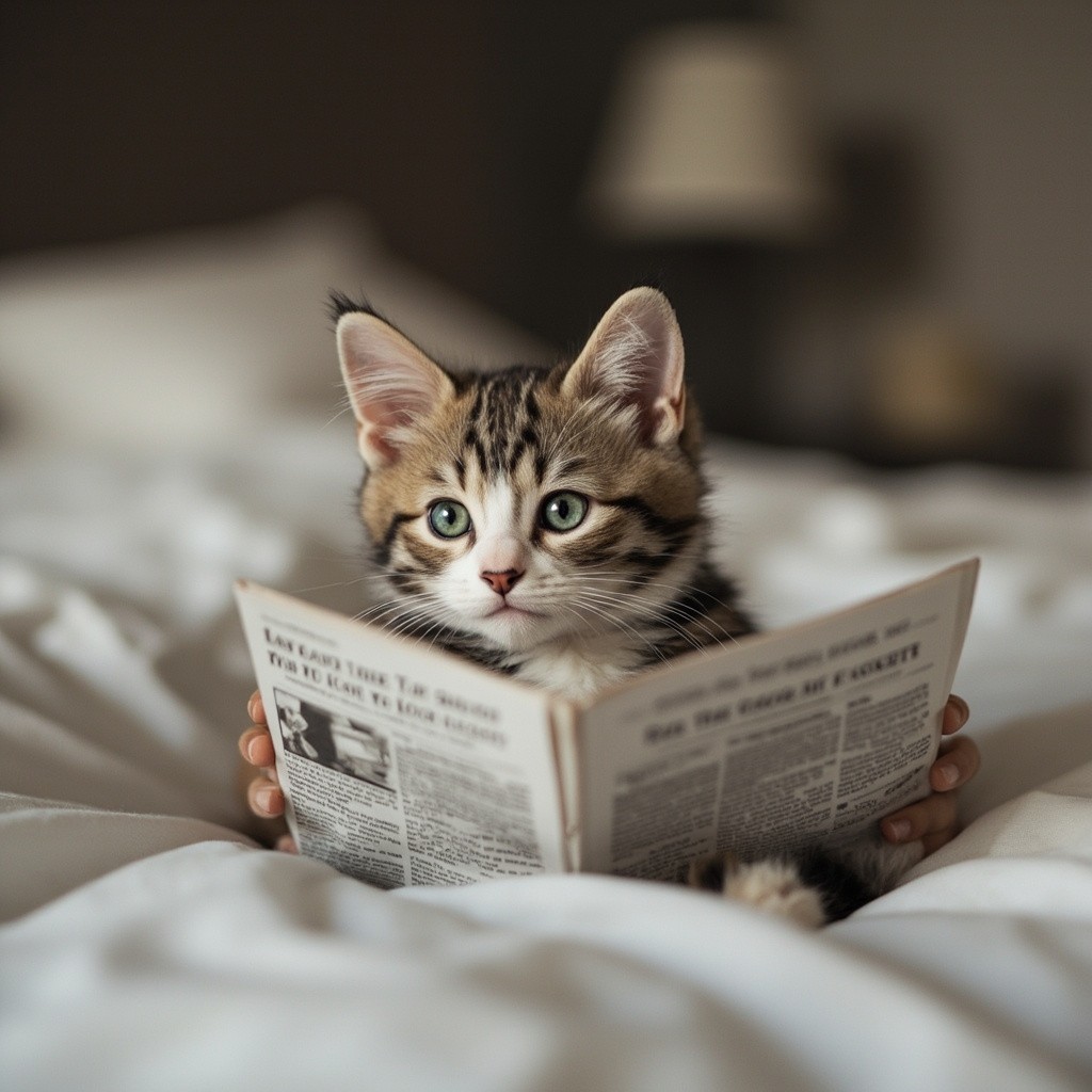 Small Cute Cat Reading Newspaper on Bed
