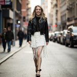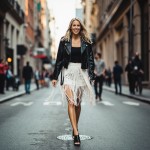 Happy Blonde Woman Walking City Street in Stylish Outfit
