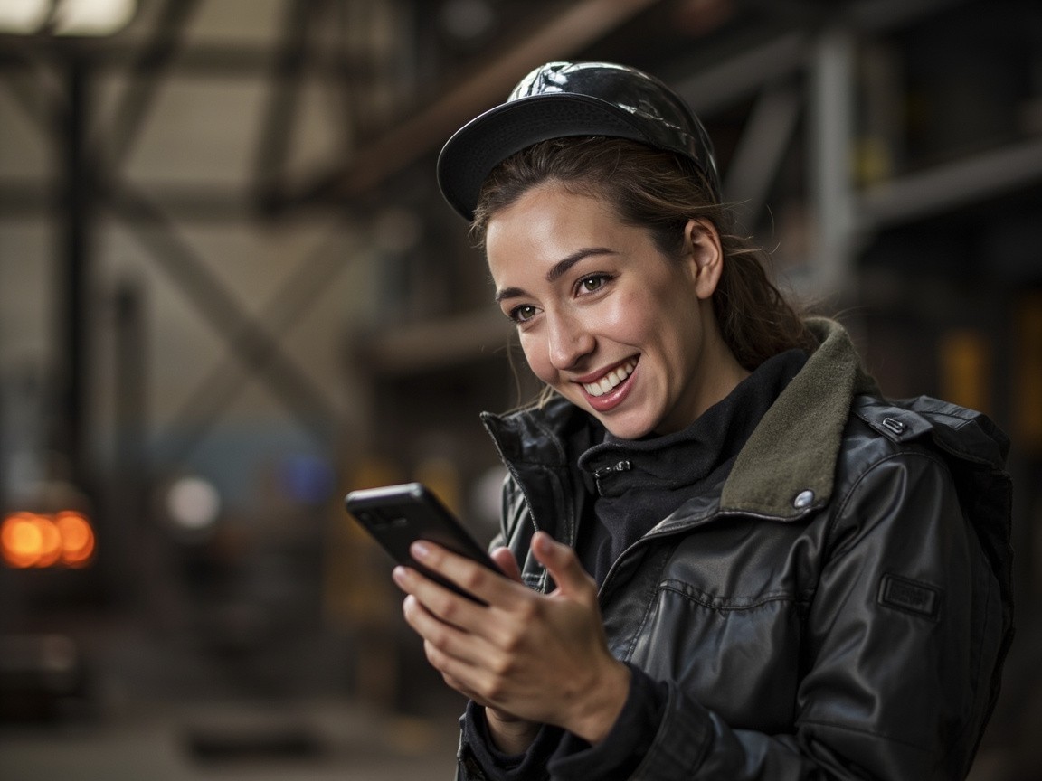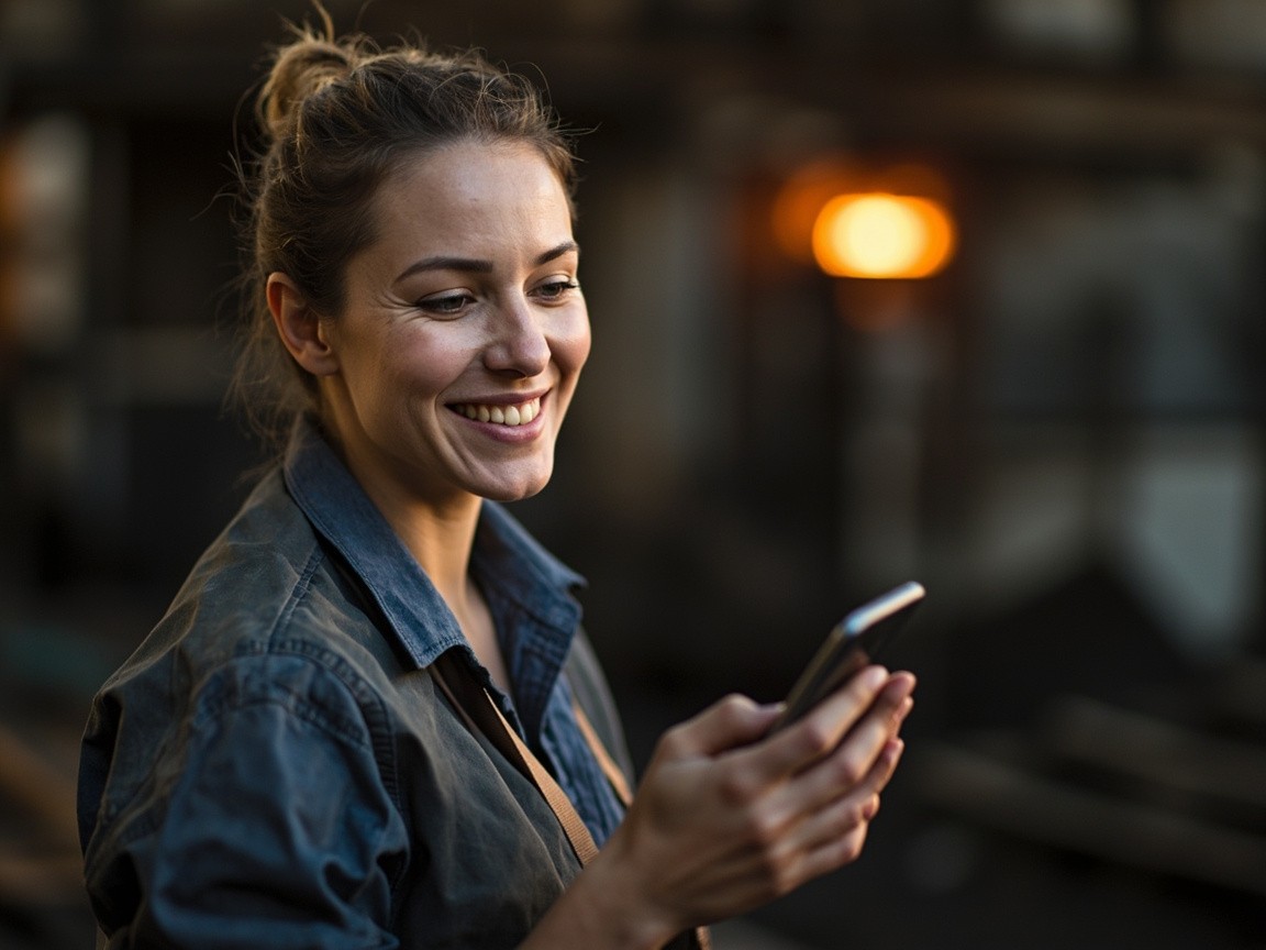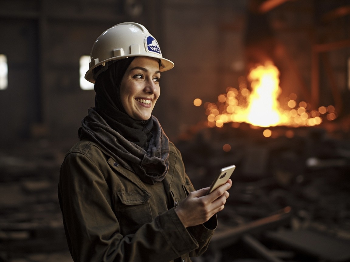 Smiling Female Worker With Cellphone in Metallurgical Factory