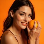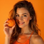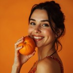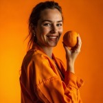 Create an image of an adult Russian girl with the appearance of a model smiling and holding orange. Remove the background, use shades of orange-#FF7E01