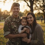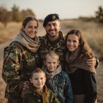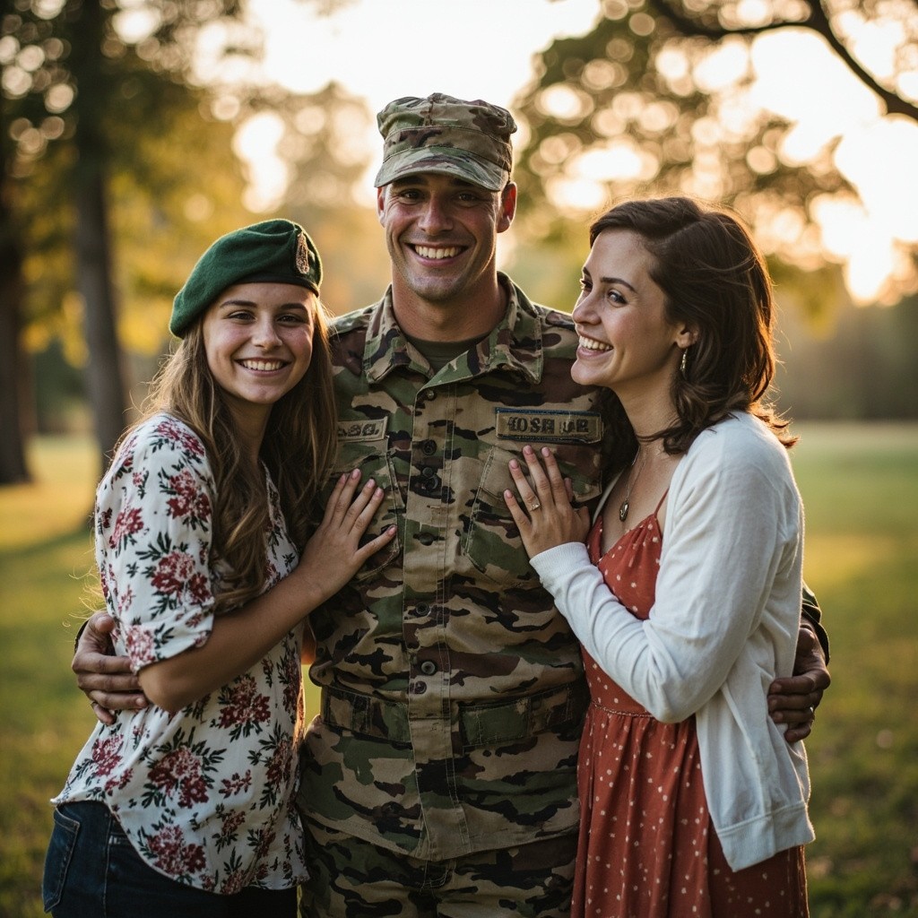 создай изображение военный стоит с семьёй и улыбается. фото хорошего качетсва как на фотоаппарат сделано