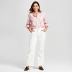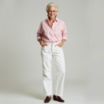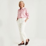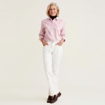 Stylish 50 Year Old Woman in Striped Oxford Shirt and Bootcut Jeans