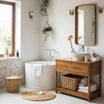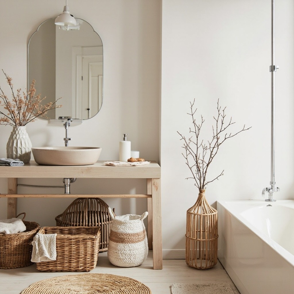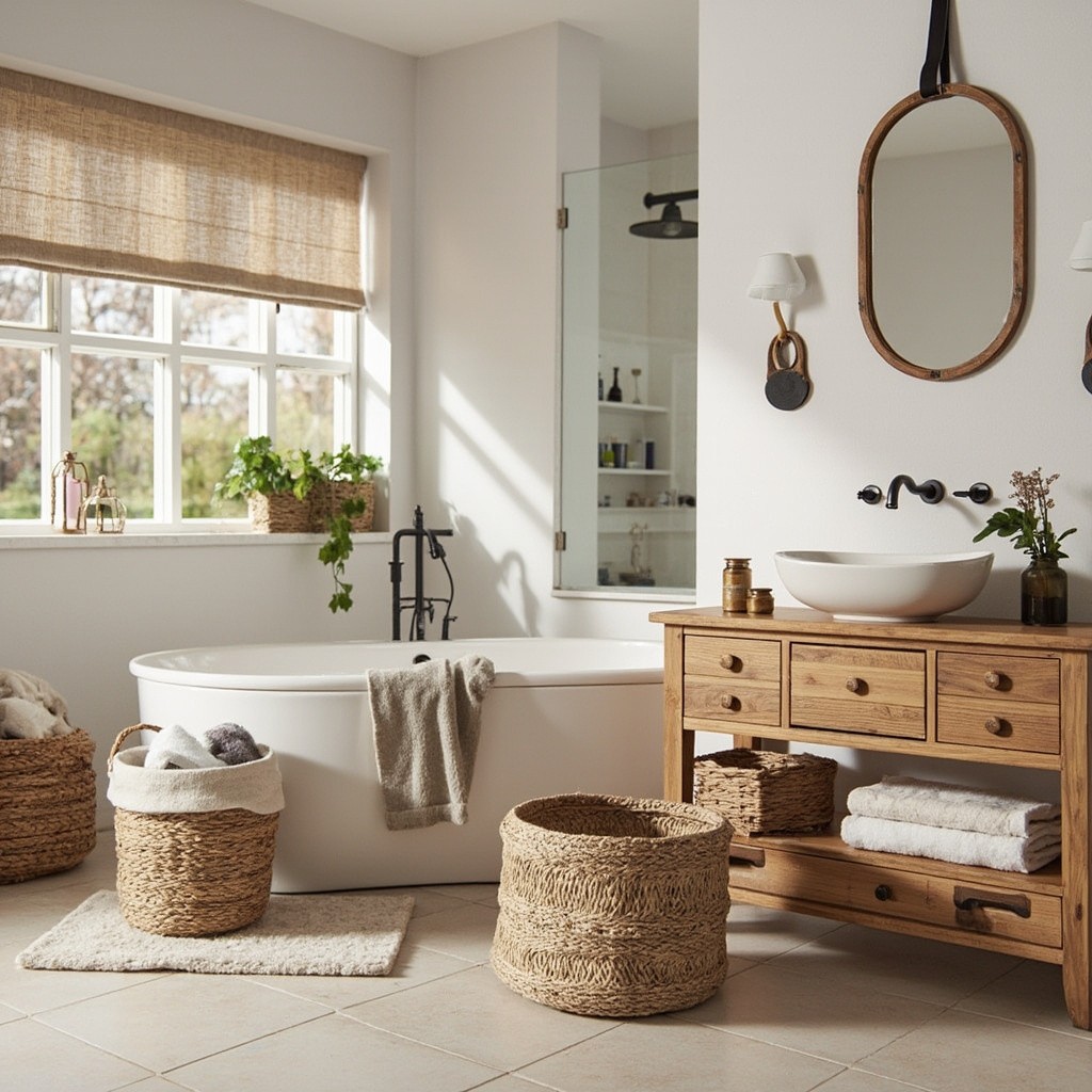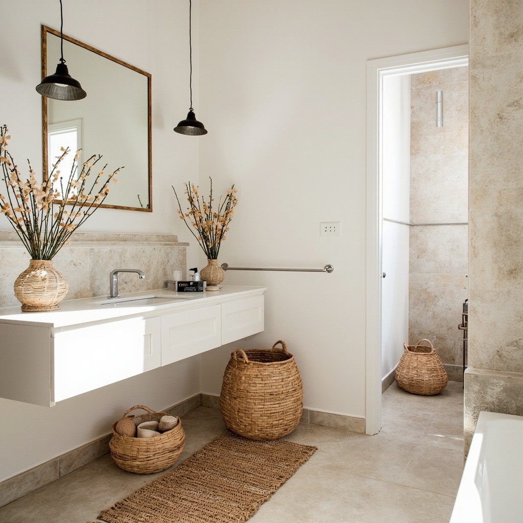 Stylish Bathroom Interior with Woven Baskets and Artificial Rattan Accessories