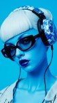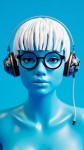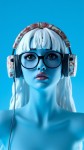 A blue-skinned woman with white hair and bangs, wearing headphones adorned with Chinese porcelain patterns and dark glasses. The background is a solid blue color, with a symmetrical composition, soft lighting, clear details, high saturation, cool tones, and a fashionable, digital art, 3D rendering style reminiscent of portrait photography.