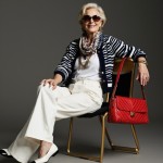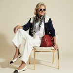 generate a 50 year old highly stylish women wearing white wide leg jeans, white ballet flats with black cap toe, a navy and white tightly fitted cardigan with a white tee shirt underneath and a printed scarf around her neck. gold earrings. add a red quilted bag on gold chair and she is wearing chain across her body.