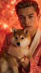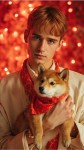 hyperrealistic portrait of a young, stylish clean-shaven man inspired by a ginger Shiba Inu,strait ginger hair, soft gaze with light brown eyes, wearing a pale red and white designer outfit with golden accessories, holding a real ginger Shiba Inu in one arm, floral indoor studio with sparkling soft red lights, chic and dreamy vibe, 9:16