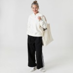 Fit Influencer Over 40 with Gray Bun, White Shirt, Adidas Track Pants, and LLBean Bag