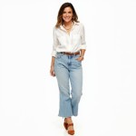 create a 40 year old stylish woman who is size 18 and an apple shape--she has a full mid section. She should be wearing a crisp white button down shirt with flared leg jeans and a belt. give her layers of pearls and chunky gold necklaces. No earrings. shoes should be tan pointed toe mules with open back. shoe full body image.