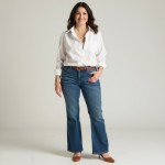 Full Body Image of Stylish Woman Wearing Flared Jeans, White Shirt, and Chunky Jewelry