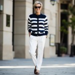 Stylish 40 Year Old Woman in Nautical Stripe Cardigan and Boat Shoes