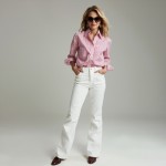 Stylish Woman in White Boot Cut Jeans and Pink Stripe Oxford Shirt