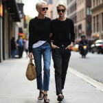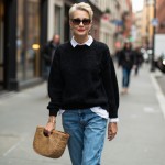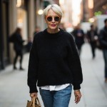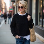 create a woman over 40 with short blond hair and red lipstick and sunglasses. She is thin and fit and wearing a black crewneck sweater with a white crew neck white tee shirt peeking out at neck and hem. She is wearing fitted straight jeans and sandals and straw bag. show her head to toe in city setting.