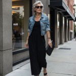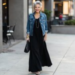 Imagine a 40-year-old woman who is highly stylish and very pretty. Hair is short silver gray and stylish. she is wearing a black jersey knit fit and flare dress that has a scoop neck, it is sleeveless and has a long full skirt. she is wearing a medium wash short sleeve denim jacket over it with black thong sandals and oversized black clutch that is quilted. give her gold thick chains at neck.