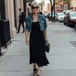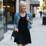 Stylish Woman with Silver Hair Wearing Black Dress and Denim Jacket
