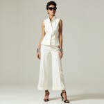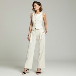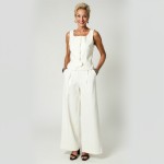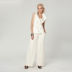 Imagine a 40-year-old woman who is highly stylish and very pretty. Hair is short and stylish. She is wearing a long fitted white vest in white with buttons. She is wearing matching white wide-leg long trousers in the same fabric and black dressy thong high-heeled sandals. Two silver bangle bracelets.