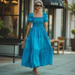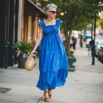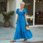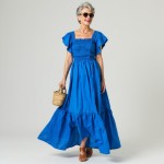 Create a 40-year-old woman who is pretty, highly stylish and wearing make up and red lipstick. She has very short gray hair and she is wearing a bright blue blue Cotton maxi dress with a wide bottom flounce and very short flutter sleeves. dress is smocked at bodice with a Deep square neck. she is wearing raffia high heel light brown leather sandals and is carryng a small straw bag with short handles.