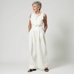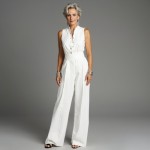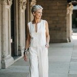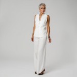 Imagine a 40-year-old woman who is highly stylish and very pretty. Hair is short silver gray and stylish. She is wearing a long fitted jewel neck white vest, no collar, in white with buttons. She is wearing matching white wide-leg long trousers in the same fabric and black dressy thong high-heeled sandals. Two silver bangle bracelets.