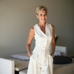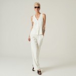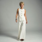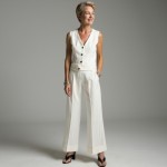 Imagine a 40-year-old woman who is highly stylish and very pretty. Hair is short and stylish. She is wearing a long fitted jewel neck white vest, no collar, in white with buttons. She is wearing matching white wide-leg long trousers in the same fabric and black dressy thong high-heeled sandals. Two silver bangle bracelets.