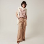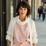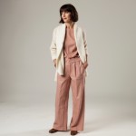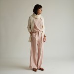 Imagine a 40-year-old woman who is highly stylish and very pretty. Hair is in an Anna Wintour bob to cheekbones with bangs. She is wearing makeup and lipstick. she has a white sweater tied around her shoulders at her neck and a pink linen boatnect sleeveless top over matching linen wide leg pants and brown slip on sandals. bracelet