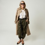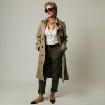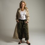 Imagine a chic forty-year-old pretty, stylish, and fashionable woman wearing a long trench coat, dark green cargo pants with black belt, a white tightly fitted tee shirt under the coat with three chunky gold chains--1 chain at neck, 1 chain longer, last chain that ends at her bust, and ballet flats in tan with a black toe cap.