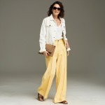 Imagine a 40-year-old woman who is highly stylish. She is wearing a soft butter yellow wide leg 2 pleat trouser, a white denim jean jacket and a soft brown oversized clutch and brown sandals.